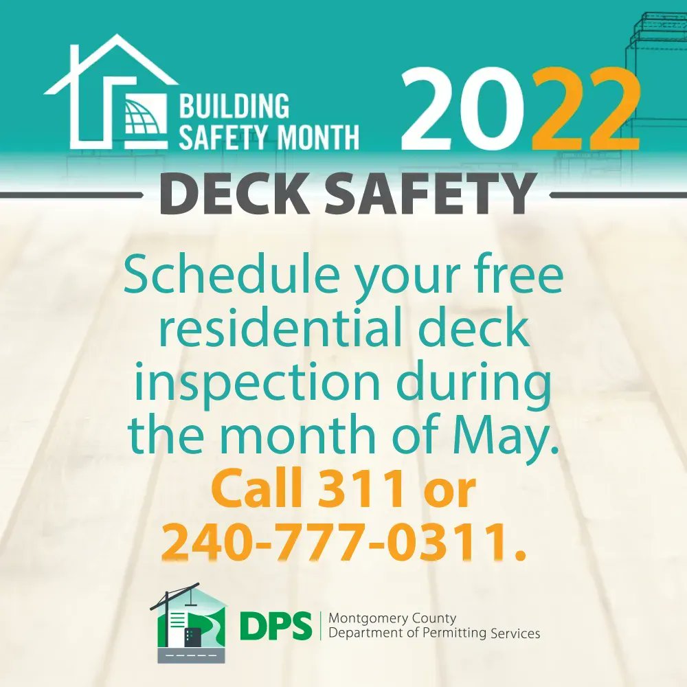 “Our free, residential deck inspection program is designed to keep Montgomery County residents informed about deck maintenance and to help them and their guests stay safe,” said County Executive Marc Elrich. “These appointments take less than 15 minutes. We encourage County residents to take advantage of this opportunity and schedule a deck maintenance inspection so they can learn firsthand from our inspectors about the condition of their deck.”
