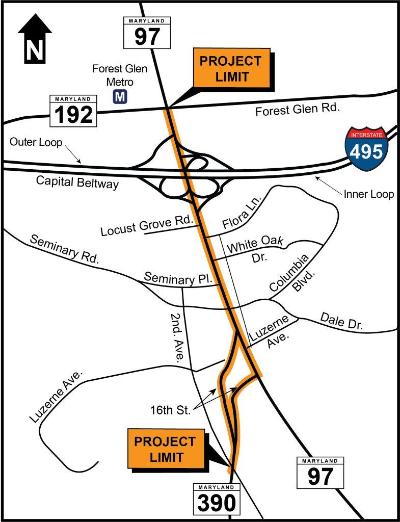 The MD 97 Montgomery Hills Safety and Accessibility Project will extend along Georgia Avenue from south of MD 390 (16th Street) to MD 192 (Forest Glen Road). It will include the interchange with the Capital Beltway (I-495) near the Forest Glen Metro Station.